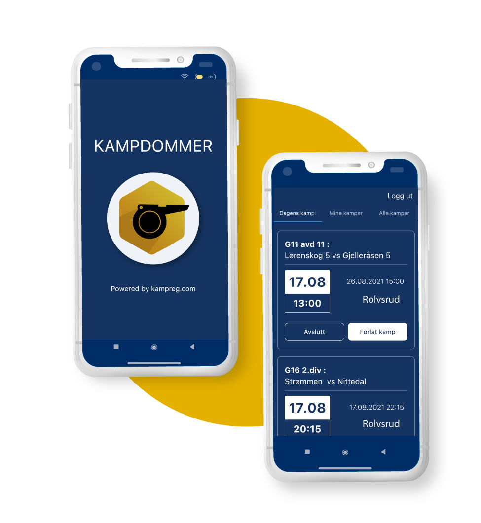 Vi har en app for dommerne, Kampdommer for dommer, og en app for ledere/trenere, Kampdommer for leder. Disse appene benyttes av dommere og ledere/trener før og etter kamp. Kampdommer kan benyttes med Apple og Android telefoner.